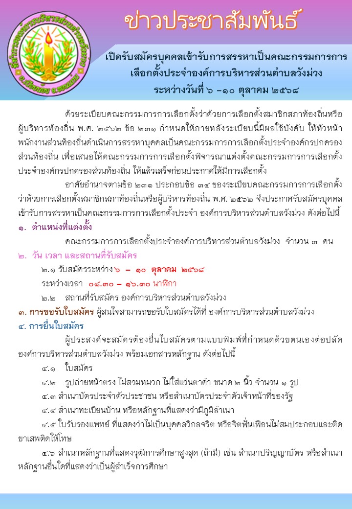ประกาศองค์การบริหารส่วนตำบลวังม่วง เรื่อง การรับส...