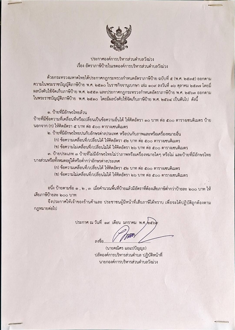 เรื่อง ให้เจ้าของป้ายที่ติดตั้งป้ายอยู่ในเขตองค์การบริหารส่วนตำบลวังม่วง ต้องเสียภาษีป้าย ประจำปี พ.ศ. 2569 ไปรับแบบพิมพ์และกรอกรายการในแบบพิมพ์ยื่นต่อพนักงานเจ้าหน้าที่